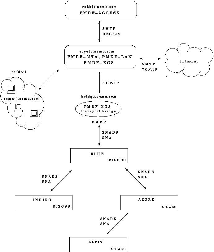 ACME.COM also has connections to the Internet over TCP/IP. ACME.COM also has four SNADS nodes, BLUE, INDIGO, AZURE, and LAPIS, and an OS/2 system, with TCP/IP name bridge.acme.com and SNADS name PMDF, that will act as the transport bridge between the SNADS side and the PMDF side. PMDF-MTA, PMDF-LAN, and PMDF-XGS have been installed on COYOTE, and PMDF-MTA and PMDF-LAN have already been configured on COYOTE. The SNADS nodes have been configured to know about the PMDF-XGS transport bridge and the COYOTE system. The PMDF-XGS transport bridge component has been installed and configured on the transport bridge system, and is using the default TCP/IP ports for communicating with the PMDF system COYOTE.