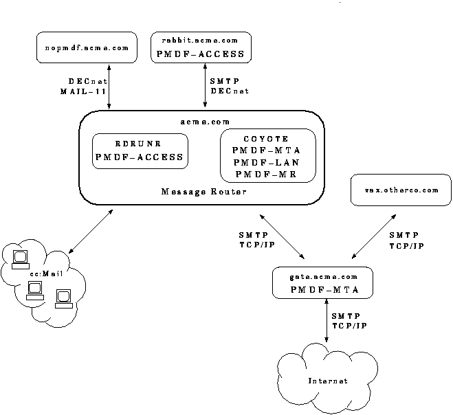 The coyote.acme.com system, also known as merely acme.com, is assumed to have been reconfigured using the PMDF CONFIGURE utility to route all messages to the Internet out by way of gate.acme.com, e.g., by answering: