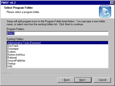 Figure 2-7 PMDF Installation Session: Select Program Folder
