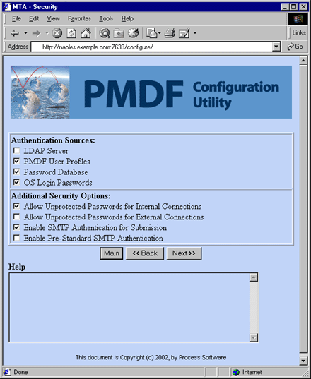 Figure 5-7 shows the list of authentication sources that PMDF can check against when it is verifying passwords. This screen also lists additional security options. Select the authentication sources and additional security options for the configuration.