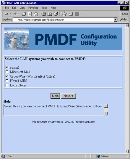 shows the initial page, where you tell PMDF which types of PC-LAN mail systems you want to connect to.