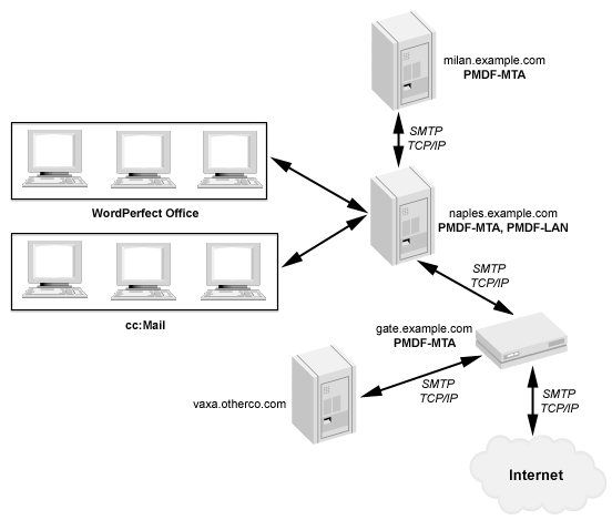 (Actually, since the milan.example.com system is a PMDF-MTA system currently configured to route all of its mail through the PMDF-MTA system naples.example.com, the gate.example.com system does not need to know about milan.example.com for the network setup as pictured. However, it does no harm to inform gate.example.com about milan.example.com now in case milan.example.com were to be reconfigured in the future to direct messages directly to gate.example.com itself, instead of by way of naples.example.com.)