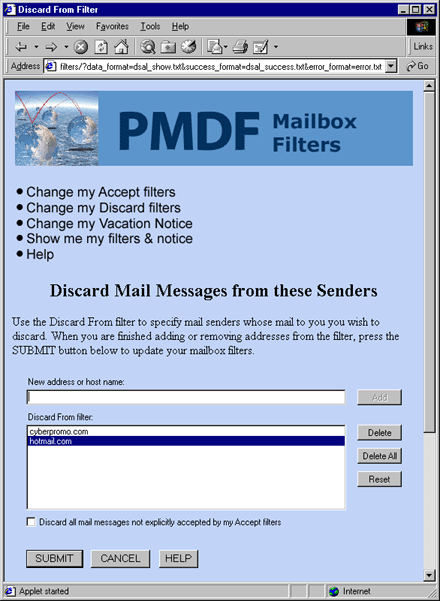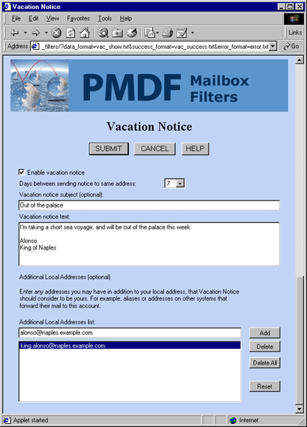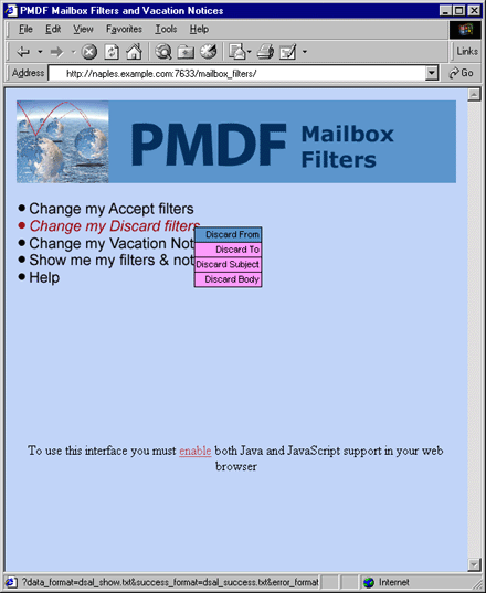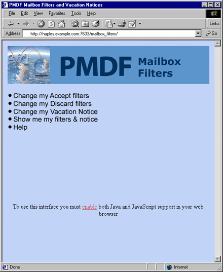 In order to use the web-based interface for setting up mail filters and vacation notices, you must have a web client and TCP/IP access to the PMDF system. Your messages must also be delivered to the native message store (VMS mailbox) on the PMDF system, or to a PMDF popstore or PMDF MessageStore account on the PMDF system.